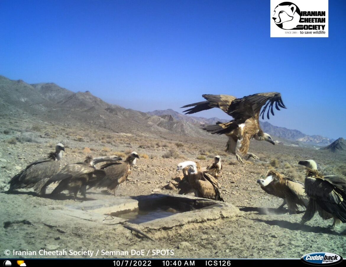 In the images captured by the Iranian Cheetah Society’s camera traps, some common vultures, which are scavenger birds of Iran, can be seen using one of the waterholes in the Turan Biosphere Reserve. This image shows that water resources, although small and limited in desert areas, are of great importance for the survival of birds.